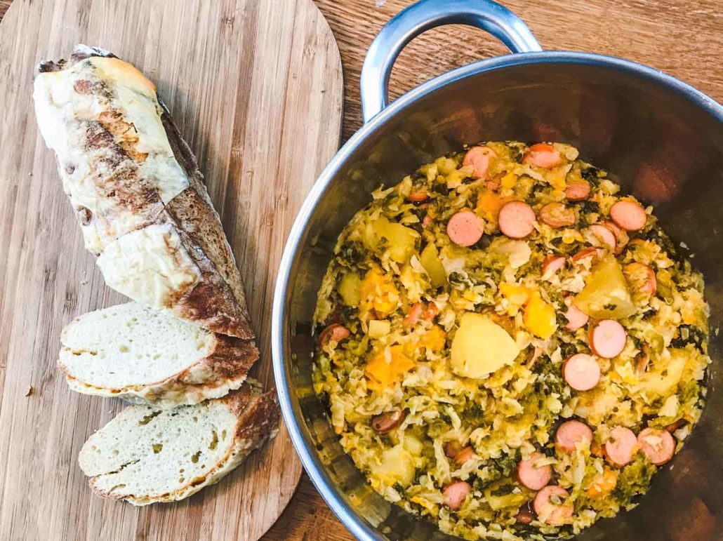 Eintopf mit Tellerlinsen, Würstchen und Gemüse